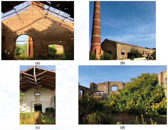 (a) A typical construction in the area; (b) the last chimney; (c) detail of a roof structure visible due to the failure of a vertical masonry wall; (d) invasive vegetation.
