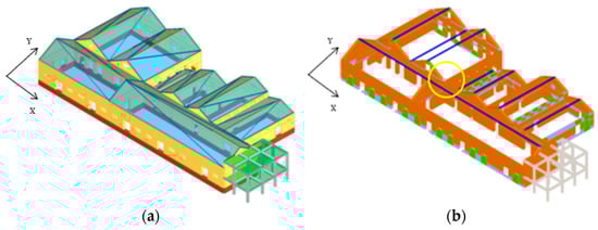 (a) Three-dimensional view of the structure numerical model; (b) meshed model of the structure with masonry piers (in brown), spandrels (in green), rigid nodes (in light blue), steel elements (in blue), and reinforced concrete columns (in grey). The yellow circle indicated the position of the control node.