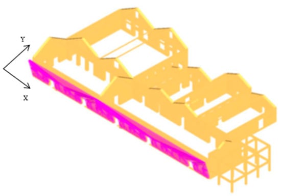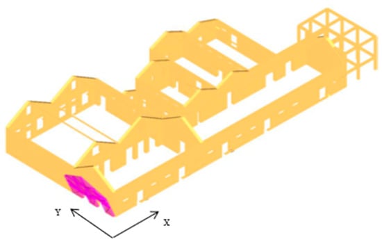 The numerical analyses in the as-built configuration were performed considering only the self-weight of the existing masonry panels, without the contribution of additional vertical loads, due to the absence of roofing and the advanced state of deterioration observed on site.