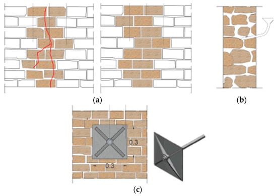 Illustration of the different consolidating operations planned for the masonry: (a) scuci and cuci technique; (b) consolidating injections; (c) insertion of metal tie rods.