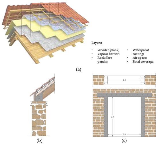 Other interventions: (a) reconstruction of the roof with a cold roof type; (b) insertion of steel curb; (c) steel frame around the openings.