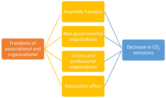 4]. Beyond the institutional mechanisms defined by Freedom House, this study also considers the reputation effect as an additional potential pathway. Countries that uphold stronger associational freedoms may benefit from greater international legitimacy and credibility, which can enhance their engagement with global environmental norms and agreements. As illustrated in