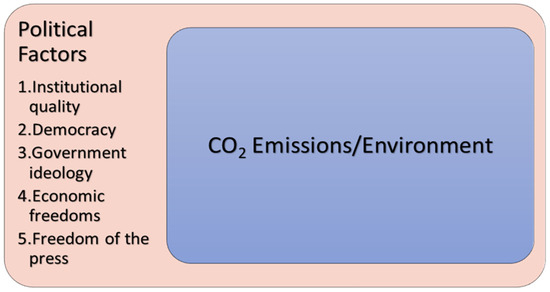 23]. With the increasing attention to the potential effects of political factors on the environment, political/institutional factors such as corruption control, ideologies, law, transparency, democracy, civil rights, and political rights have gradually become more integrated into the literature [