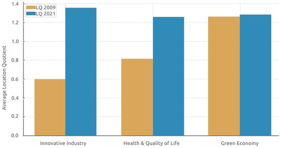 To ensure methodological transparency, only sectors with available data for both 2009 and 2021 are included. While the LQ method does not capture the full complexity of innovation dynamics, it remains one of the few robust and longitudinal indicators available at the regional level, and it is widely used in both policy and academic research [1,9].