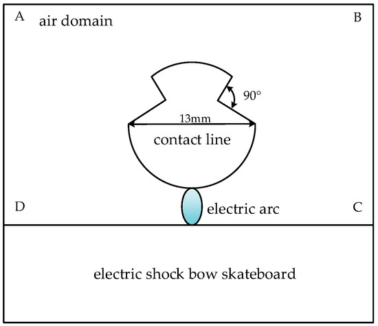 Prior to conducting simulation analysis on the pantograph-catenary arc, it is essential to first establish the geometric model of the system under study. Considering the symmetrical characteristics of the pantograph-catenary system in three-dimensional space, this study employed a two-dimensional modelling approach to establish a simplified arc model as shown in Figure 1 for enhanced the computational efficiency while maintaining simulation accuracy. Unlike most existing studies that omit the contact line groove structure from their models, the present work retains this feature, along with other essential components including the contact line and collector bow skateboard. The diameter of the contact line is 13 mm, the thickness of the collector bow skateboard is 14 mm, and the groove angle of the contact wire is 90° [17].