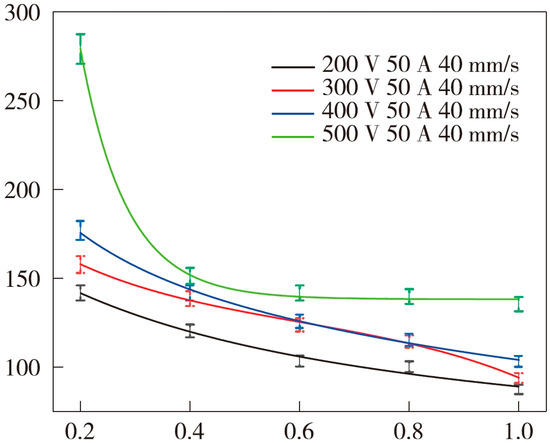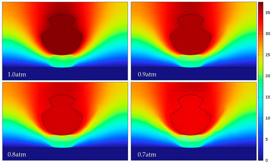 From the trends in Figure 4, the axial potential of the pantograph-catenary arc under the four different air pressures studied can be observed to increase steadily and then trend linearly between the axial distances of 0.3 mm and 3.7 mm, and it begins to change abruptly in the two near-electrode regions. The maximum values of the anode region are 37.5 V, 36.2 V, 34.8 V, and 33.6 V, respectively, and the mutation rates are 63.04%, 64.55%, 65.71% and 76.84%, respectively. These results demonstrate that higher pressure leads to more significant arc potential variations. From this, it can be concluded that when the air pressure decreases, the axial voltage of the pantograph-catenary arc gradually decreases.