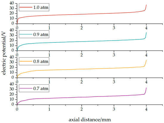 To systematically analyse the effect of air pressure variations on pantograph-catenary arc potential, axial potential data were extracted under four distinct air pressure conditions. The corresponding potential distribution curves were subsequently plotted for comparative analysis, as presented in Figure 4.