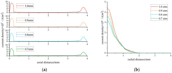 To better assess the effect of atmospheric pressure on the current density characteristics of the pantograph-catenary arc, the longitudinal and transverse current density profiles of the pantograph-catenary arc were extracted, and the distributions of current density along both axes were plotted. The axial and radial current densities of the pantograph-catenary arc at varying atmospheric pressures are shown in Figure 5.