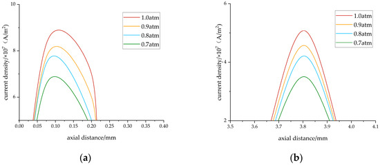 Peak Values of the Axial Current Density of the Pantograph-Catenary Arc under Different Air Pressure Levels. (a) Arc cathode peak; (b) Arc anode peak.