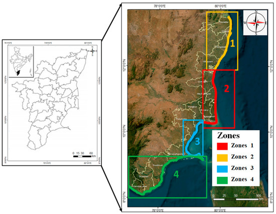 Study area map showing the Coromandel Coast of Tamil Nadu, highlighting four major coastal zones divided with respect to geographical features.