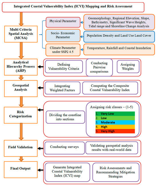 A flowchart illustrating the CVI methodology, integrating geospatial analysis, MCSA, and ICVI for coastal vulnerability assessment.