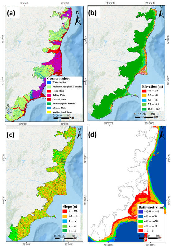 This study advances existing vulnerability assessment methods by integrating physical, socioeconomic, and climatic factors into a unified framework. Unlike traditional indices, it incorporates climate change impacts such as temperature rise, rainfall variation, and coastal flooding inundation. This comprehensive, adaptable, and quantitative approach enhances accuracy and applicability across different coastal regions, offering a more robust tool for coastal vulnerability assessment. The Tamil Nadu Coromandel Coast faces increasing threats from coastal hazards, including erosion, rising sea levels, and severe weather events, influenced by climate change and human activities [33,34]. The rapid growth of urban areas, lack of oversight in coastal construction, and elevated population concentrations intensify these issues, rendering coastal communities, infrastructure, and ecosystems particularly vulnerable to degradation. Conventional assessment approaches sometimes inadequately reflect coastal vulnerability’s complex spatial and temporal dynamics. This difficulty underscores the necessity for sophisticated methodologies, including Geographic Information Systems (GISs), satellite remote sensing, and the Coastal Vulnerability Index (CVI). For the study to determine areas of high risk, it is essential to assess essential physical parameters, such as geomorphology, elevation, slope, bathymetry, tidal ranges, significant wave height, and shoreline changes. Furthermore, the study examines how population density and land use patterns affect coastal vulnerability while evaluating the effects of increasing temperatures, changes in precipitation, and extreme weather events on erosion, flooding, and ecological degradation. The study integrates various factors to propose strategic solutions, and it emphasizes incorporating nature-based approaches, early warning systems, resilient infrastructure, and community participation to strengthen long-term coastal resilience. Our findings will assist decision-makers in formulating sustainable coastal management approaches, promoting environmental integrity and socioeconomic resilience for at-risk coastal populations.