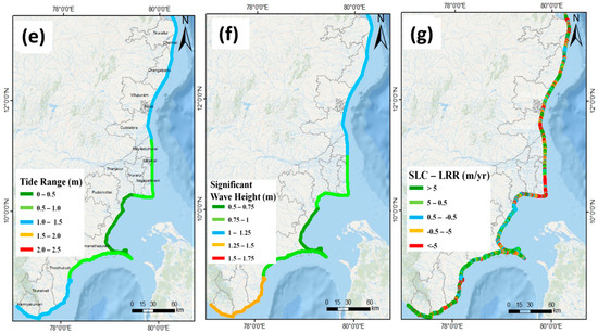 (a) represents coastal geomorphology and affects shoreline stability and erosion; (b) shows elevation (m) and has lower elevations that flood and receive storm surges; (c) shows slope (°) and affects water runoff and erosion rates; (d) affects bathymetry (m) and the impact of wave energy and storm surges; (e) shows the mean tidal range (m) and affects the tidal flood area; (f) shows significant wave height (m) and causes coastal erosion and coastal structure damages; and (g) shows the shoreline change rate (m/year). By combining the seven elements, the PVI provides a thorough evaluation of coastal vulnerability.