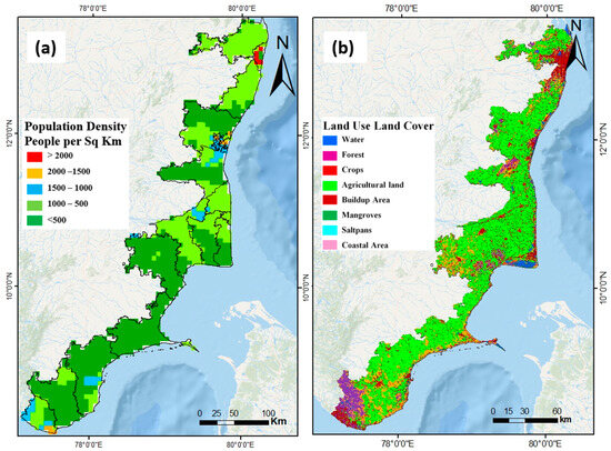 Socioeconomic parameter maps representing human exposure and land utilization patterns along the coast: (a) population density and (b) land use/land cover.
