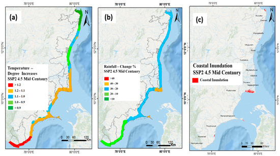 Maps of climatic parameters highlighting future climate threats in vulnerable zones: (a) temperature, (b) rainfall, and (c) coastal inundation.
