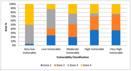 The coastal vulnerability assessment classifies zones into five categories: very low, low, moderate, high, and very high vulnerability (Figure 6). Zones 1 and 2 exhibit the highest levels of risk, with 29.71% and 26.21% of their areas classified as highly vulnerable and 28.76% and 30.06% categorized as very highly vulnerable, respectively. In contrast, Zone 3 predominantly falls under the low (38.01%) and very low (28.90%) vulnerability categories, suggesting relatively stable coastal conditions. Similarly, Zone 4 has a significant proportion of very low (31.07%) and moderate (22.87%) vulnerability levels, though it still contains notably high-risk areas (17.93%). Overall, moderate vulnerability (24.55%) is the most dominant classification across the study area, followed by low (20.23%), high (19.89%), and very high (19.77%) vulnerability levels. These results reveal spatial variations in susceptibility to coastal hazards, underscoring the need for targeted mitigation strategies, sustainable coastal management practices, and adaptive policies to enhance resilience against climate change and human-induced pressures.