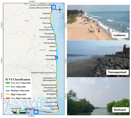 To evaluate coastal vulnerability considering physical, socioeconomic, and climatic aspects, recent research has progressively adopted integrated models. By including 21 physical and socioeconomic characteristics into a modified Coastal risk Index (CVI), Nigam et al.’s [36] research on coastal risk at the village level in Canacona, South Goa, India, thoroughly assessed and proved the need for a targeted and thorough investigation to comprehend spatial differences in susceptibility and develop appropriate coastal management plans. The Integrated Coastal Vulnerability Index (ICVI) integrates three major components—physical, socioeconomic, and climatic factors—offering a more comprehensive assessment of coastal vulnerability. This formula has been used by researchers since 1991, including Gornitz et al. [11], Thieler and Hammar-Klose [37], Nigam et al. [36], and others [18,38,39,40]. This approach enhances regional specificity by focusing on the dominant drivers of vulnerability on the Coromandel coast, ensuring high interpretability for local management. Furthermore, this method optimizes available high-fidelity data, providing a robust and practical assessment of coastal susceptibility relevant to regional planning and adaptation strategies.