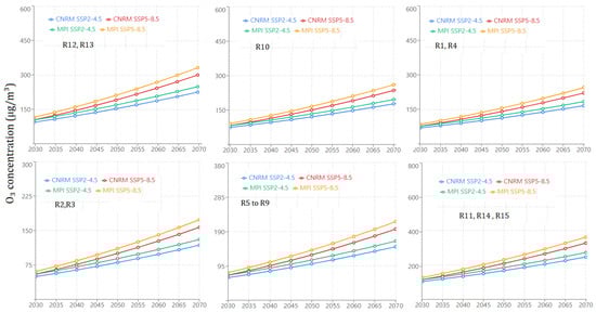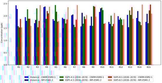 Ozone concentrations show even more dramatic increases across all scenarios and models (Figure 8). Historical concentrations (2000–2015) were relatively uniform across regions R1–R6, with both models indicating concentrations between 85 and 95 μg/m3. The CNRM-ESM2-1 model shows slightly higher historical values (88–95 μg/m3) compared to MPI-ESM1.2 (85–92 μg/m3), with minimal spatial variation.