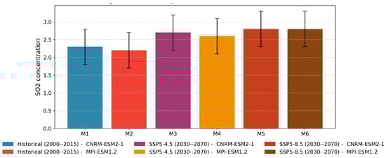 These results align with those of previous studies, such as those by Langner et al. [56] and Ward [57], which demonstrated the significant impact of climate change on atmospheric sulfur pollutants, notably through changes in precipitation patterns and temperatures that affect the chemical conversion and transport of SO2. These observations underscore the importance of integrating climate projections into air quality management strategies to anticipate the long-term effects of climate change on atmospheric pollution and on public health.