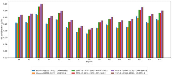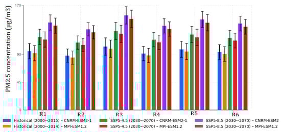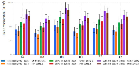 A comparison between the historical and projected PM2.5 concentrations reveals significant temporal and spatial variations across the study domain (Figure 7). Historical data (2000–2014) from both the CNRM-ESM2-1 and MPI-ESM1.2 models show relatively uniform concentrations across regions R1–R6, with values ranging from 35 to 50 μg/m3. The CNRM-ESM2-1 model indicates slightly higher historical concentrations (40–48 μg/m3) compared to MPI-ESM1.2 (35–45 μg/m3), with R3 showing the highest historical values in both models.