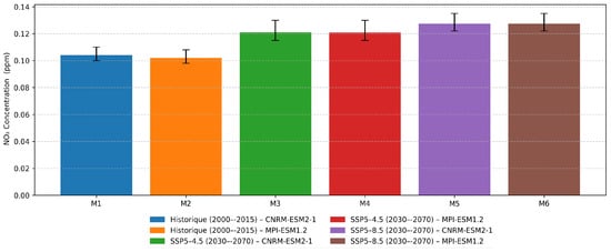 Regional NO2 concentrations simulated by CMIP6 models (CNRM-ESM2-1 and MPI-ESM1.2) for the historical period (2000–2015) and future projections (2030–2070) under SSP5-4.5 and SSP5-8.5 scenarios.