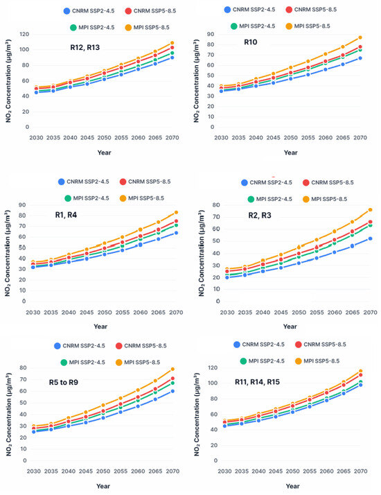 Figure 5 presents the temporal evolution of NO2 concentrations from 2030 to 2070 across several representative zones of Riyadh, based on two climate models (CNRM and MPI) combined with two contrasting socio-economic scenarios (SSP2-4.5 and SSP5-8.5). A progressive and pronounced increase in concentrations is observed in all studied zones, particularly under the MPI model with the SSP5-8.5 scenario. The most affected areas include major traffic corridors (R11, R14, R15) and densely urbanized zones (R12, R13), where concentrations exceed 100 μg m−3 by 2070—well above the annual limit recommended by the World Health Organization (40 μg m−3) [2]. These results reflect the combined effects of intensified anthropogenic activities, rapid urbanization, and increased emissions from road transport in the context of unfavorable climate change [63,64]. Increases are also recorded in semi-natural areas (R2 and R3), indicating regional diffusion of pollutants.