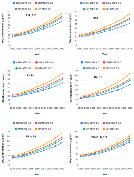 Temporal projections of SO2 concentrations between 2030 and 2070 reveal marked spatial stratification, with significantly higher levels in urbanized areas (R12, R13) and transport corridors (R11, R14, R15) than in semi-natural zones (R2, R3), consistent with urban–rural gradient observations documented in the literature [67,68] (Figure 6). A comparative analysis of the SSP2-4.5 and SSP5-8.5 scenarios highlights the nonlinear amplification of pollution under the high-emission scenario, with concentrations potentially exceeding 70 μg m−3 by 2070, representing 2–3 times the WHO-recommended thresholds [2,69].