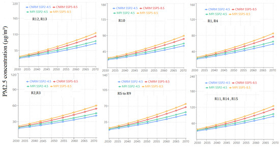 The SSP5-8.5 high-emission scenario reveals the most severe deterioration, with marked differences between models and regions. The CNRM-ESM2-1 model projects concentrations reaching 60–68 μg/m3, with R3 and R5 showing the highest values (∼68 μg/m3 and ∼65 μg/m3, respectively). The MPI-ESM1.2 model projects slightly lower but still critical concentrations (58–65 μg/m3), maintaining R3 as the most polluted region (∼65 μg/m3). When compared to historical data, this represents an increase of 35–70% depending on the region and model, as evidenced by the mean concentrations presented in Table 4.