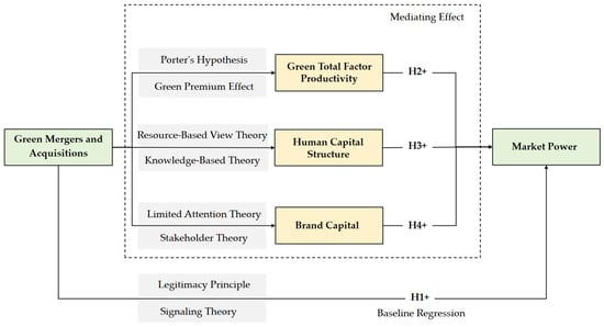 As an intangible asset, brand capital enables heavily polluting enterprises and their products to establish a distinctive image, thereby enhancing their core competitiveness through increased market share [54]. Green M&As, conversely, enhance the acquirer’s portfolio by increasing the number of low-carbon and sustainability-focused brands, diminishing brand overlap and thereby promoting brand diversification [55]. Firstly, green M&As enable heavily polluting enterprises to complement their respective sustainable resource advantages more effectively [47]. This allows the acquirer to gain a broader range of non-overlapping brands post-merger, thereby facilitating dominance across diverse green product lines, expanding market coverage, and maximizing brand diversity within the low-carbon sector [42]. Secondly, as a strategic market positioning tool, green M&As allow the acquirer to flexibly introduce green differentiated brands or reposition existing brands to align with sustainability goals. This enhances consumer acceptance and recognition in competitive markets [56]. The premium associated with environmental protection brands resulting from green M&As represents a typical synergy effect [57]. This synergy enhances bargaining power by increasing recognition among both consumers and investors, ultimately translating into market power. Additionally, based on the limited attention theory, when confronted with numerous heavily polluting enterprises, stakeholders are more inclined to focus on those that possess an environmental protection brand image and high sustainable brand value [58], thereby increasing their trust in such enterprises. Finally, following the green M&As of heavily polluting enterprises, the correlation between the original brands is significantly diminished, thereby enhancing the flexibility of the acquirer in management. During this process, the acquirer typically gains access to sustainable complementary resources, which facilitates reducing marketing organizational friction during the green M&A integration phase and diminishes the reliance on redundant resources from the heavily polluting enterprises that have been eliminated through green M&As [59]. In accordance with the resource-based view theory, an enterprise’s competitive advantage stems from unique, valuable, and non-imitable resources and capabilities. As an intangible asset, brand capital’s irreplaceability and difficulty of imitation substantially bolster the market power of heavily polluting enterprises. To sum up, this study puts forward Hypothesis 4.