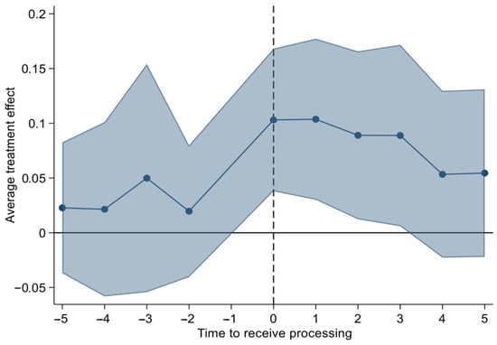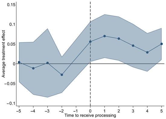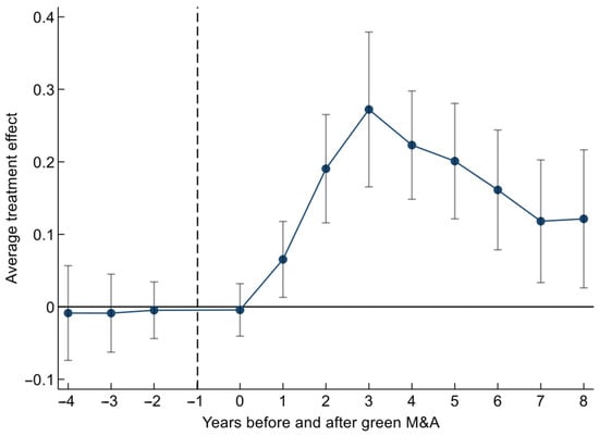 The seventh approach excluded samples that had engaged in multiple green M&A transactions during the research period. In the benchmark estimation, while the approach of designating the year of an enterprise’s first green M&A as the treatment year helps avoid overlapping treatment effects that may arise when heavily polluting firms undergo multiple green M&As across different years, it could also somewhat compromise the accuracy of the average treatment effect estimation. To address this concern, this study follows the methodology of Tang et al. [32], focusing only on heavily polluting enterprises that experienced a single green M&A. These enterprises constitute the treatment group used in the robustness test, with results presented in Column (7) of Table 5. The regression coefficient associated with green M&As remains significantly positive, thereby reinforcing the robustness of the study’s central findings.