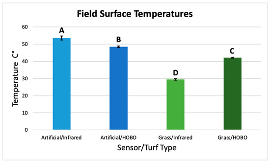 Surface temperatures on artificial turf and natural grass fields were measured using infrared thermometer and HOBO sensors. Bars indicate means ± one standard error. Different letters indicate the differences among data bars, with p < 0.0001 determined by Tukey’s Honestly Significant Difference test.