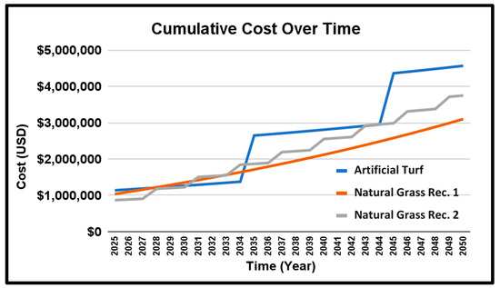 By comparing the costs of installation and maintenance, the most cost-effective option over a 25-year period was identified. A period of 25 years was chosen for this case study because it covers the lifespan of artificial turf multiplied by two. This analysis accounted for the frequency of maintenance activities and the expected lifespan of the turf. Averaging the inflation rates over the past ten years concluded an inflation rate increase of 2.5% per year. This was also factored into the cost–benefit analysis.