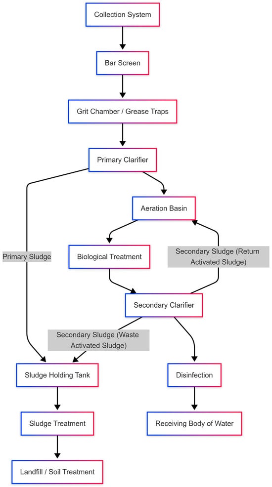 Regardless of whether the incoming water is industrial or domestic [19], treatment plants employ a series of stages as simply demonstrated in Figure 1, pre-treatment, primary treatment, secondary treatment, and tertiary treatment [17], each relying on pumps and blowers and collectively accounting for a substantial portion of the facility’s energy consumption. In the pre-treatment stage, pumps lift the influent, while blowers are used in aerated grit chambers to create a spiral flow that helps separate heavier inorganic materials like sand and grit from wastewater. The energy consumed in this stage is relatively small compared to other processes but is essential for preventing damage to downstream equipment and improving the efficiency of subsequent treatment phases. For scum removal in primary treatment, air blowers are used to aid in the collection of floating materials like fats, oils, and grease by creating froth that can be easily skimmed off the surface, while pumps transfer settled sludge.