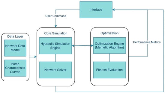 The developed framework offers a sophisticated real-time simulation and optimization environment designed specifically for wastewater pumping networks, integrating advanced Memetic Algorithms (MAs) to minimize energy consumption. The solution method consists of different phases that include the solution of the hydraulic system, the input data and their arrangement, and the optimization module that feeds into the simulation the values that the simulation is then going to use in the loop again in order to solve the network. For this model, the case of five parallel centrifugal pumps was considered, each characterized by manufacturer-specific performance curves (as an example of data provided from the manufacturer in Table 1), which describes the relationships between flow rate, total head, and shaft power using polynomial functions.