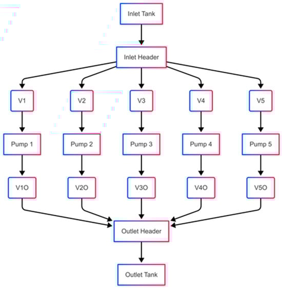 The hydraulic simulation engine was modeled and developed in order to solve flow and pressure distributions across the network under various demand scenarios, accounting for head loss, valve statuses, and pump operating points. Solving this network includes detailed computations for quadratic frictional losses and precise rotational speed (RPM) interpolation, notably increasing model accuracy and operational adaptability. In addition to component-level modeling, the hydraulic behavior of the system network is mathematically represented through a graph data model, as shown in a simplified version in Figure 3, that includes a combination of node and arc equations. Nodes represent junctions or components (e.g., pumps, tanks), while arcs denote the flow paths between them. Mass conservation is enforced at each node using continuity equations, and headloss equations (Darcy–Weisbach and empirical polynomial models) are applied to each arc to compute pressure drops or head requirements [29].