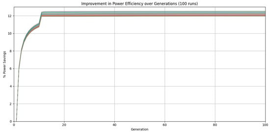 Convergence trajectories of percentage power savings achieved by the Memetic Algorithm across 100 independent runs. Each thin line represents a single run; the algorithm reaches ≥12% savings within the first 10–15 generations and then stabilizes, indicating reliable convergence to a near-optimal solution.