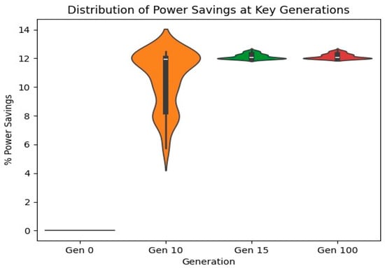 Violin plots of % power savings: Gen 0 shows no gain; Gen 10 displays wide exploratory spread; by Gen 15 and persisting to Gen 100 the distribution contracts tightly around ≈ 12%, confirming convergence.