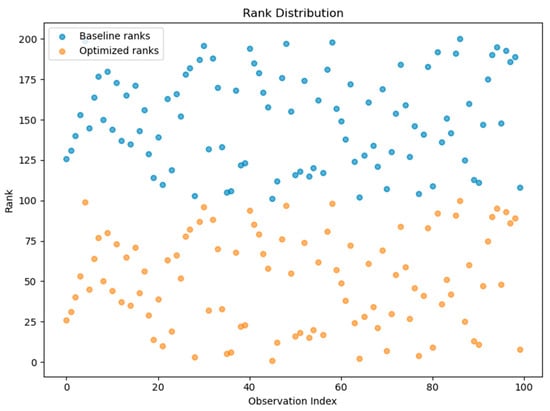 In Figure 6, all optimized runs (orange) achieved lower ranks (lower energy consumption) than all baseline runs (blue) when ranked together (n = 200 total observations), demonstrating perfect optimization effectiveness. Specifically, the MA demonstrated an average power reduction of approximately 485.64 kW, corresponding directly to the previously reported average savings.