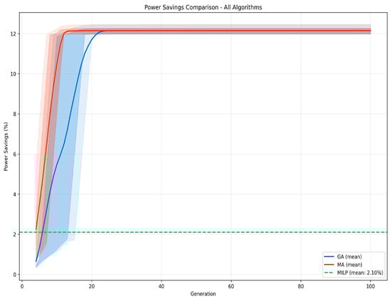 The convergence behavior of the MA is illustrated in Figure 4, highlighting rapid initial progress in power savings during the first 10 generations. This early rapid improvement underscores the algorithm’s efficiency in exploring promising regions of the solution space. After 15 generations, the improvement rate decreased, entering a stable plateau phase where the solution quality consistently settled at an average reduction of 12.13%. The stabilization at this point suggests the algorithm had effectively reached a near-optimal or optimal solution state.