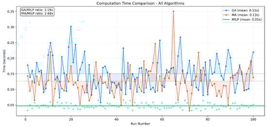Average computation time per run: MA ≈ 0.13 s, GA ≈ 0.15 s (both ≈ 3× slower than MILP’s 0.05 s) yet still suitable for real-time use given MA’s higher energy-saving accuracy.