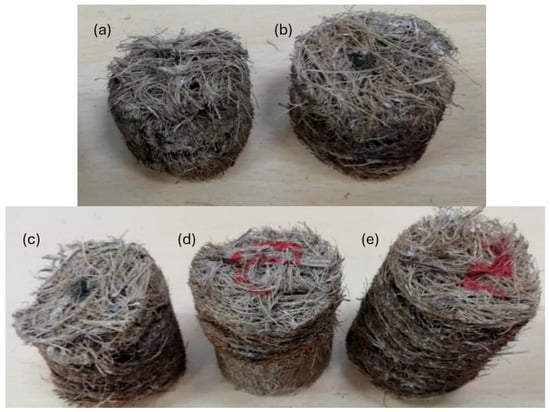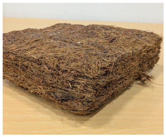 19]. This moisture can plasticize the cellulose-based components of the fibers, reducing their Young’s modulus and increasing their elongation at break, which ultimately compromises their mechanical strength and durability. Nevertheless, coir fibers remain recognized for their inherent strength, durability, and resistance to environmental conditions, which makes them suitable for various applications, from textiles to agricultural uses, and they have been widely considered in research as sound absorbent materials for buildings [