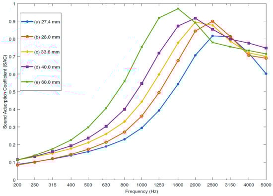 Figure 9 presents the results of the impedance tube measurements, analyzed in one-third octave bands. Each colored curve in the figure corresponds to the acoustic absorption for a specific material thickness tested. The horizontal axis shows the analyzed frequencies, displayed on a logarithmic scale and segmented into one-third octave bands, with the vertical axis showing the measured sound absorption coefficient (SAC). Given that the weight-to-volume ratio was highly consistent across all samples, with a standard deviation of ±2.9 kg/m