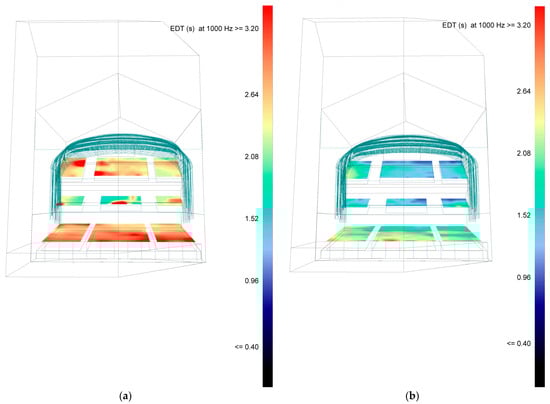 Figure 10 shows the EDT at the specific frequency of 1000 Hz for the original and modified materials configurations. A substantial reduction in the EDT at the seat of the auditorium can be appreciated. It is worth highlighting that the behavior of the right and left sides of the stalls and amphitheater is not symmetric, since the stage is not symmetric either, and this affects the sound reflections.