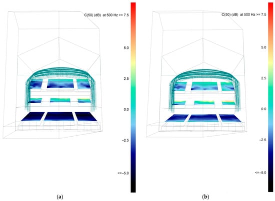 Figure 11 shows the speech clarity (50) at 500 Hz for the initial and modified configuration of the auditorium. It can be appreciated that in the initial configuration, there are areas in the stall, near the stage, with values of C50 below 0, that compromise the acoustic quality of these locations.