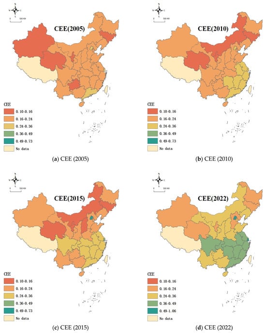 where C E E i , t denotes the natural logarithm of carbon emission efficiency in province i during period t; a n d   G T I i , t × C E E i , t represents the interaction term between green technological innovation and the logarithm of carbon emission efficiency.