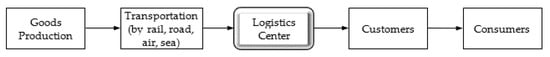 Secondly, the transport sector is special in that it is closely linked to almost all other sectors, since the price of every good or service includes transport costs. Thirdly, the transport sector accounts for almost 30 percent of all energy consumption [8]. Transport is also significant due to growing production volumes, economic ties between countries caused by globalization processes, regional development, and thus the increasing scale of international transportation. Therefore, there is a need to look for ways to improve the transport systems of countries and increase the efficiency of their activities [10]. When searching for them, it is necessary to evaluate today’s requirements for cargo transportation: reducing CO2 emissions, increasing transportation safety, reducing road loading, reducing time losses at transshipment points, faster cargo delivery, reducing the time for preparing and processing transportation documentation, reducing overall transportation costs, etc. [11]. It is clear that it is impossible to meet these requirements by transporting goods by one mode of transport. A transport system must be formed that would ensure the effective planning, organization, and management of the delivery of finished products from their production to the place of consumption. In essence, it is a transport logistics system that combines different modes of transport—air, rail, road, and water—as well as all elements of the supply chain (cargo storage, loading, unloading, transportation, etc.). In an organizational sense, all these elements are combined by a logistics center. The principal model of the cargo supply chain by transport is presented in Figure 1.