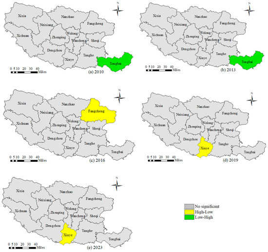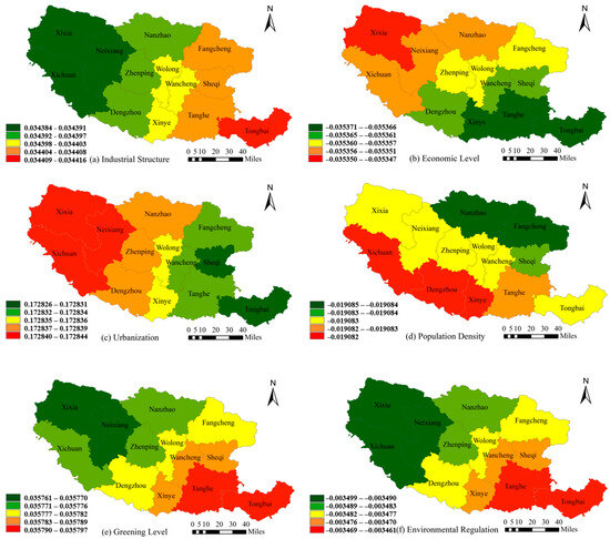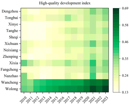 - In general, no obvious spatial correlation existed between the CCD of HQD-ES in Nanyang City. Tongba, Fangcheng, and Xinye displayed spatial correlation characteristics of L-H aggregation and H-L aggregation, which indicated that spatial heterogeneity in the study area was more pronounced than homogeneity. According to GWR results, the coupling coordination degree of Nanyang City was significantly positively affected by industrial structure, urbanization, and greening level, but significantly negatively affected by economic level, population density, and environmental regulation.