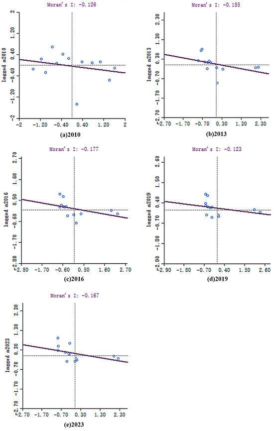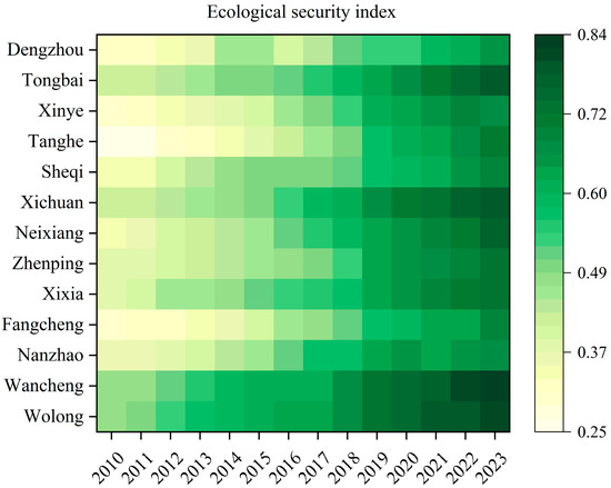 - In the study area from 2010 to 2023, the level of high-quality development showed a slow upward trend, and the level of ecological security maintained an upward trend. In terms of spatial pattern, high-quality development showed the structural characteristics of “the highest in the central zone, the relatively high in the western zone, and the lowest in the eastern zone”. The level of ecological security displayed the pattern characteristics of “highest in the central, relatively high in the west and southeast, and lowest in the south”.