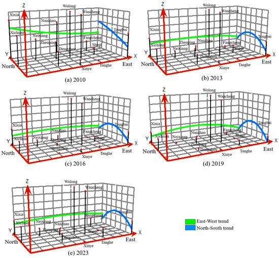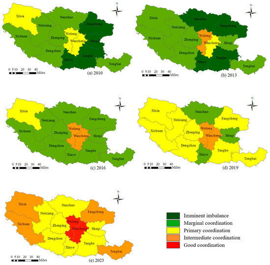 - The CD increased from 2010 to 2023, but the increase was small, and the whole was in a highly coupled stage. The mean value of CD in Wolong was the highest, 0.9933, which was always a state of high coupling during this time. The average value of CCD increased significantly, from imminent imbalance to good coordination state. Compared with 2010, the research area in 2023 was mainly dominated by primary coordination. Wolong and Wancheng were in a good coordination state, and the overall CCD trend was good. The spatial pattern exhibited characteristics of “prominent in the middle and stable in the north and south”. The gap in coordination degree along the east–west direction gradually narrowed, and the overall coupling coordination level of central cities was higher than that of county-level cities.