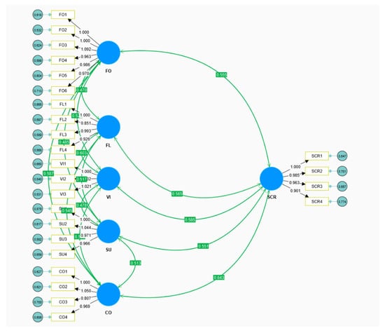 The reliability and internal consistency of the constructs were first examined using Cronbach’s alpha and composite reliability (CR). As reported in Table 3, all constructs exhibit Cronbach’s alpha values well above the acceptable threshold of 0.70 (most exceeding 0.80), indicating high internal consistency. Similarly, the CR values for each latent construct range from approximately 0.86 to 0.90, also surpassing the recommended 0.70 benchmark for exploratory research [37]. These results confirm that each construct is measured with a high degree of consistency, providing a solid foundation for validity assessment.